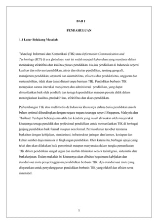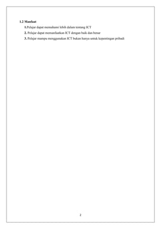 Dokumen ini membahas pentingnya pemanfaatan teknologi informasi dan komunikasi (TIK) dalam pendidikan di Indonesia, serta tantangan yang dihadapi dalam penerapannya. Pendidikan berbasis TIK dapat meningkatkan mutu, akses, dan efektifitas belajar, namun mengalami hambatan terkait kebijakan, infrastruktur, dan kesiapan sumber daya manusia. Penyediaan prasarana yang memadai dan dukungan terhadap guru serta siswa sangat penting untuk mengoptimalkan pemanfaatan TIK dalam proses pembelajaran.