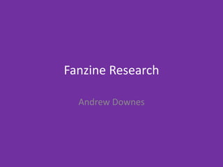 The document summarizes research on several fanzines. Key ideas taken from the fanzines include using a clear layout, balancing images and text with a 50/50 ratio, and using vibrant colors. Mythology and video games were cited as potential topics. Concerns included fanzines having a niche audience and the researcher not previously being aware of fanzines. Overall fanzines were deemed a poor medium for selling ideas compared to books, magazines, or blogs.