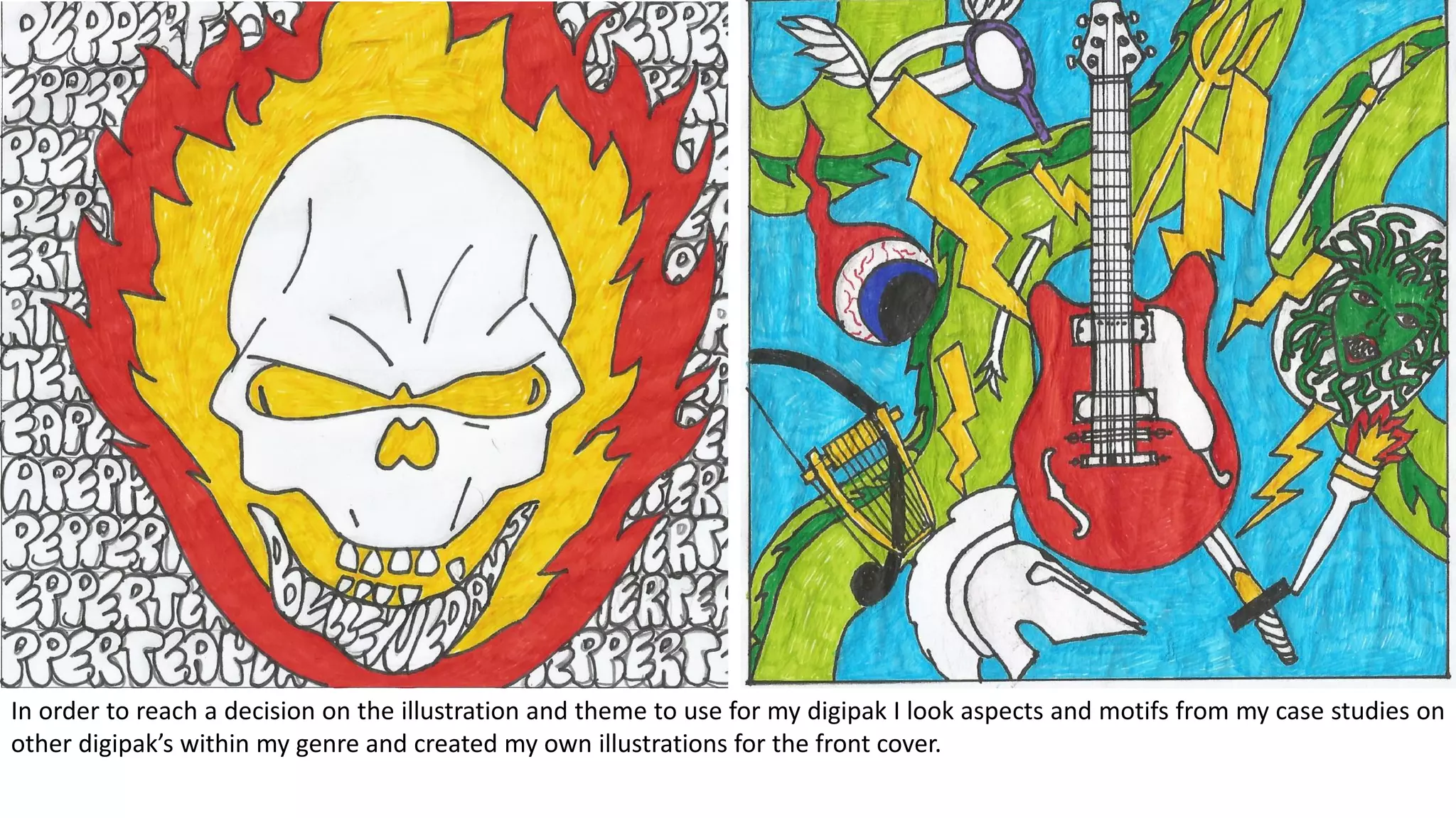 The document discusses the process of designing a digipak for an album. The author decided on a drum and flames theme with bright colors based on case studies of other albums in the same genre. A drum kit was chosen as the focus of the front cover to highlight the "feature" track and tie into a music video. Consistent fonts and colors were used throughout the digipak design to create an overall theme and brand identity while not overloading the senses.