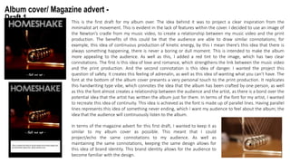 This document contains evaluations of different draft designs for an album cover, magazine advertisement, and panels for the artist's print production. The final design incorporates feedback to feature the artist's face for branding and draws visual connections to the music video through similar colors and actors featured. Simplistic designs with negative space are intended to draw the audience's attention to key elements and create mystery around the artist while promoting a theme of romance. Consistent fonts, colors and imagery across formats aim to develop a cohesive brand identity.