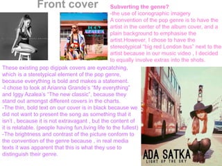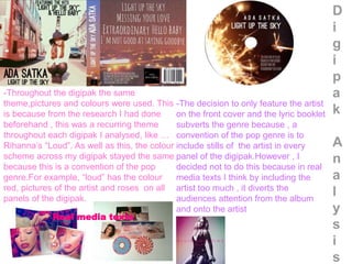 This document analyzes the conventions used in designing a digipak for a pop song. Some conventions discussed include using consistent colors, themes and images of the artist throughout the digipak. While the front cover and lyric booklet typically feature the artist, only including the artist on the front cover subverts this convention. Real pop digipaks are also analyzed for conventions like bold colors and images that make statements. While conventions like listing songs and including copyright info are followed, some elements are subverted, like not using close-up shots of the female artist that conform to male gazes.