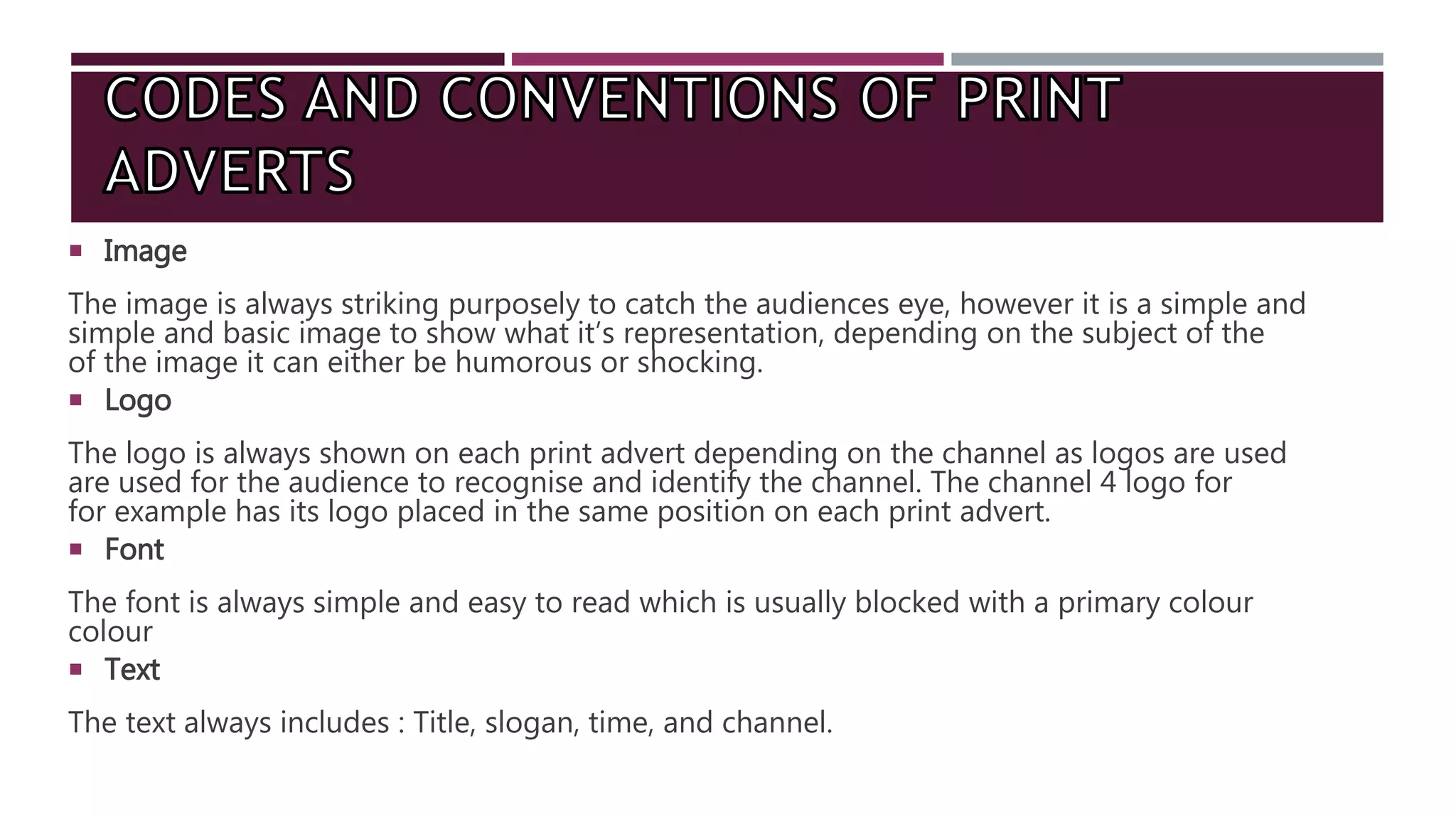 Print ads typically include an eye-catching image, channel logo in a consistent location, easy-to-read font often in a single color, and text providing the title, slogan, time and channel.