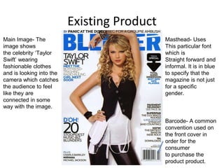 The document provides research on existing magazine covers, analyzing their common features and aspects to include in a new magazine design. It describes elements like the main celebrity image drawing in a target audience, mastheads in eye-catching colors, and barcodes for purchase. The research analysis notes both magazines used a central celebrity image in clothing approving of the audience. It will take this approach, adding surrounding content as a quick teaser to entice buyers to read more inside.