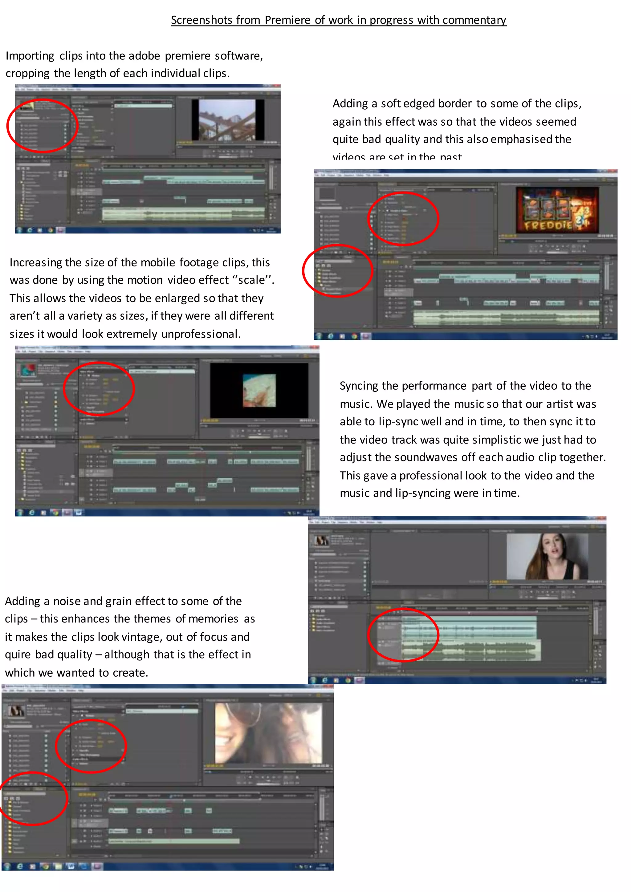 The document describes editing video clips in Adobe Premiere, including importing clips, cropping lengths, increasing mobile footage sizes using scale effects, adding noise and grain effects to make clips look vintage, adding soft borders to emphasize low quality, and syncing a performance to music by adjusting audio clips to match soundwaves and ensure lip syncing is on time.