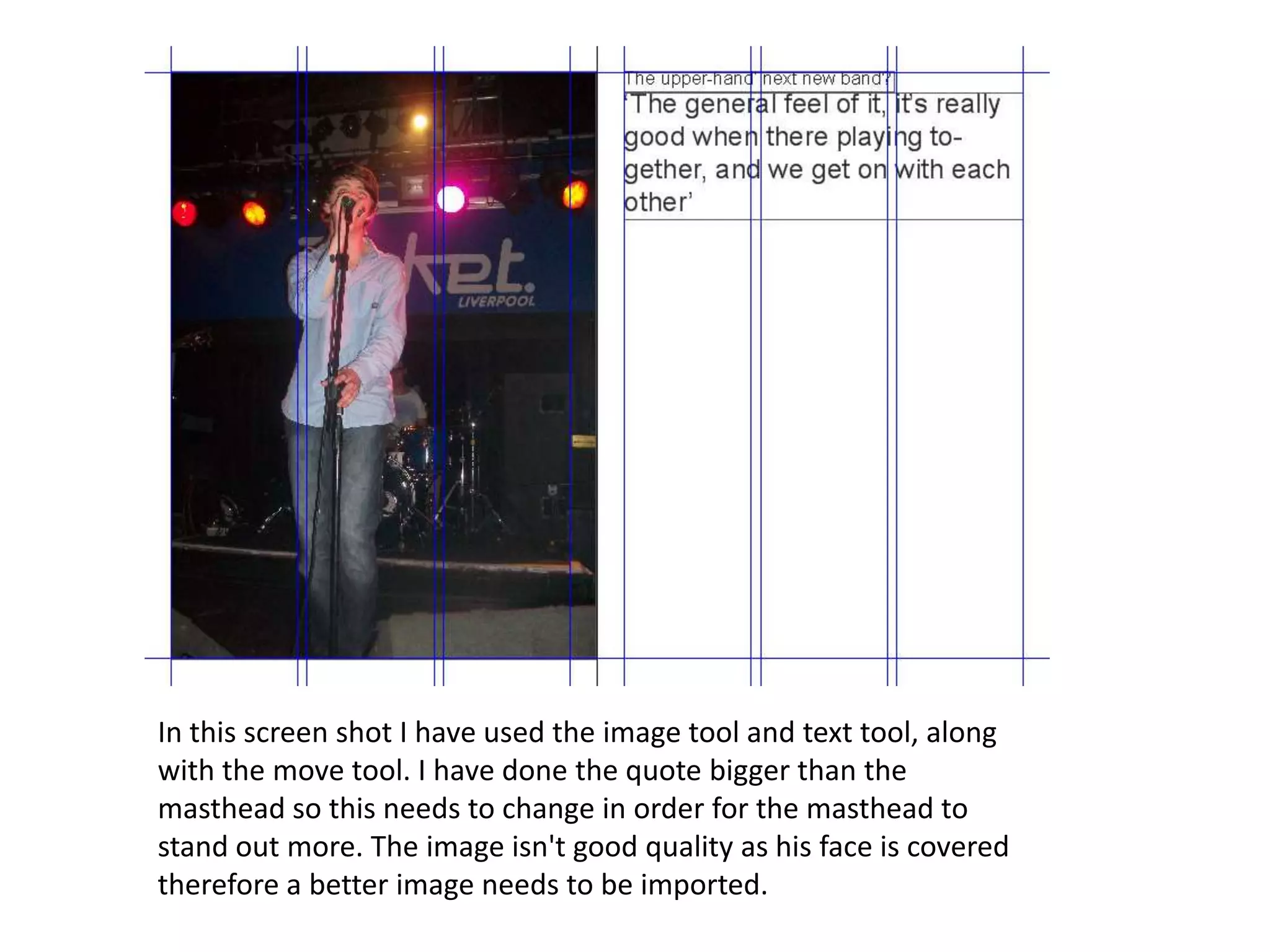 The document describes the process of designing a double page magazine spread in QuarkXPress. It includes screenshots showing adjustments made such as changing images, fonts, sizes, colors and layout. The masthead, quotes and text are refined over multiple iterations. Tools used include the image, text, move and font tools. The final design features a bold masthead in Elephant font with a shadowed background and larger drop capital.