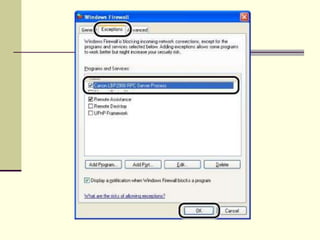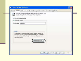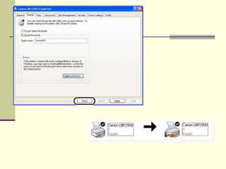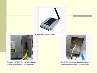 A print server manages print requests and printer queue status information. It connects printers to client computers over a network, accepting print jobs and sending them to the appropriate printers. Print servers support protocols like Internet Printing Protocol (IPP) and Line Printer Daemon protocol (LDP). They can be networked computers or dedicated devices. Setting up a network printer involves configuring the printer's network settings and sharing it with other devices on the network or through cloud printing.