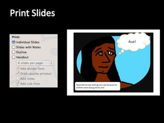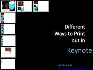 There are several ways to print slides from a Keynote presentation including printing individual slides, printing multiple slides per page up to 6 slides, and printing notes or outline slides which allow for taking notes alongside the slides.