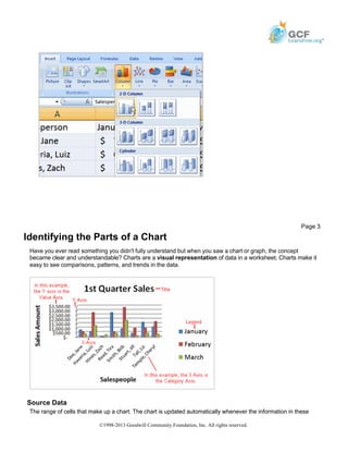 This document provides instructions for creating and modifying charts in Excel. It explains how to insert a chart using selected data, identify the different parts of a chart, change the chart type and layout, apply styles, and move the chart to a different worksheet. The goal is to teach the reader how to use charts effectively to visually communicate data trends and comparisons from a spreadsheet.
