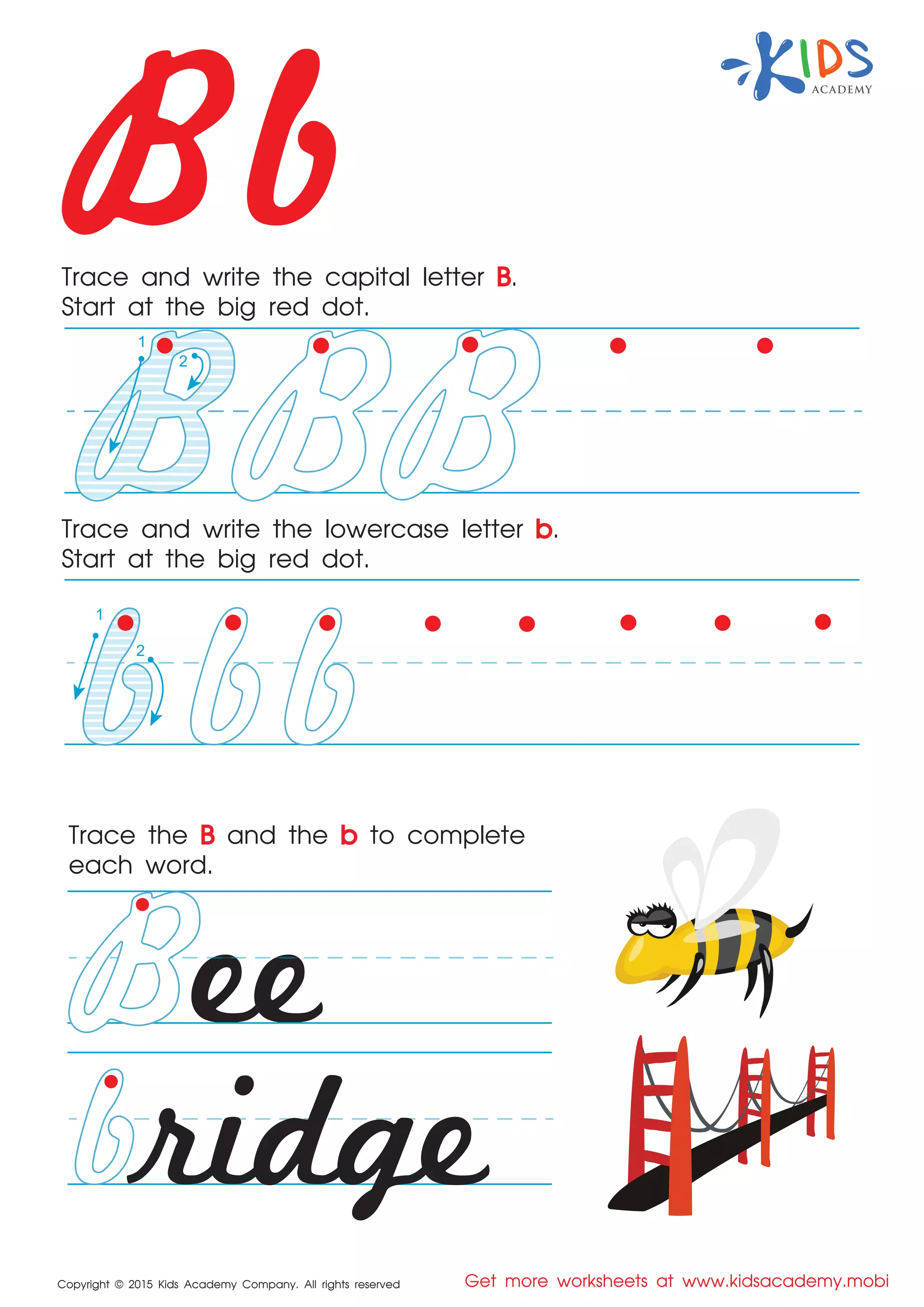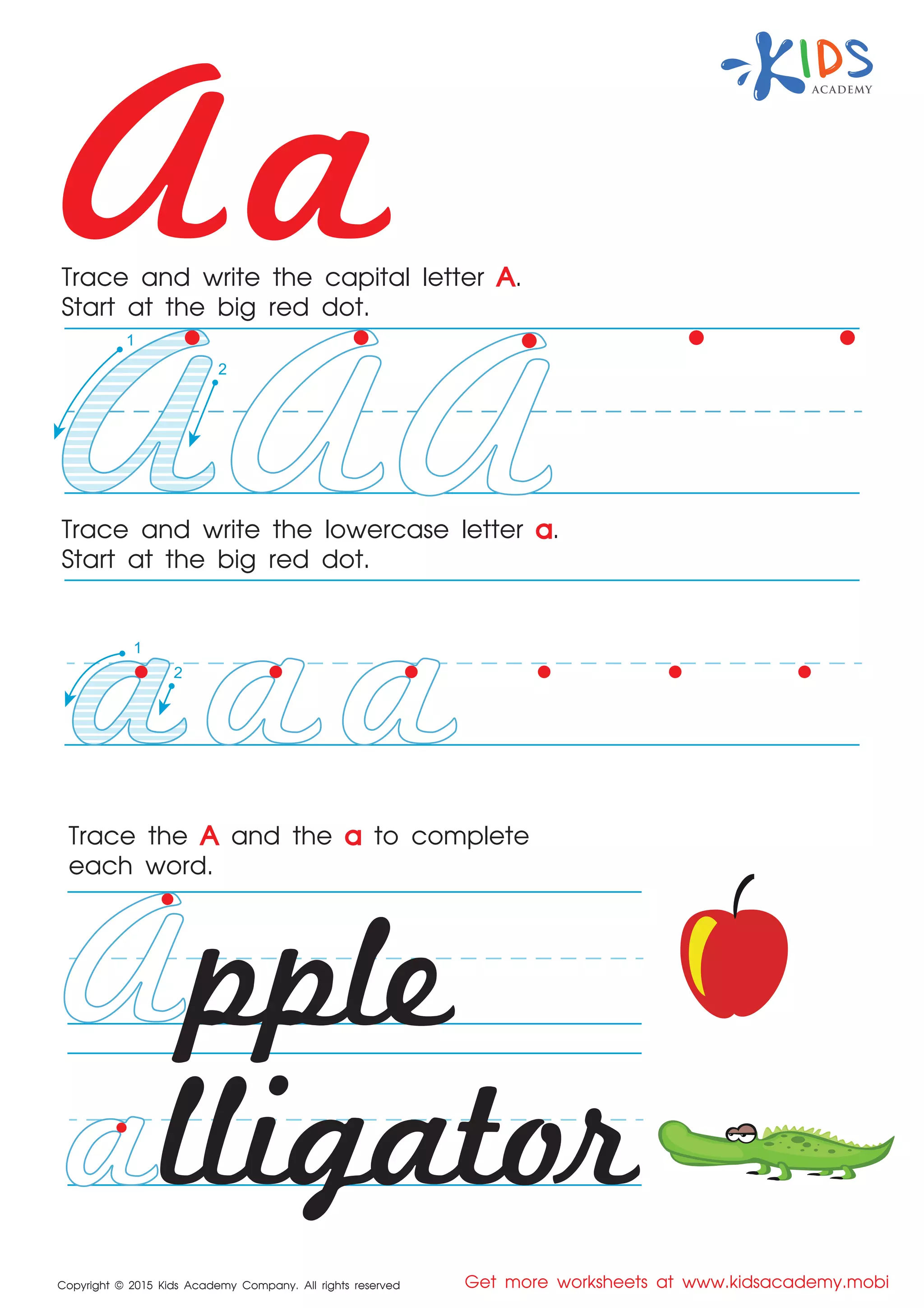 The document provides tracing exercises for uppercase and lowercase letters from A to Z, guiding users to start at a designated 'big red dot' to trace each letter. Each letter is accompanied by example words that begin with that letter, promoting handwriting skills for children. It is published by Kids Academy Company and is part of their educational resources.