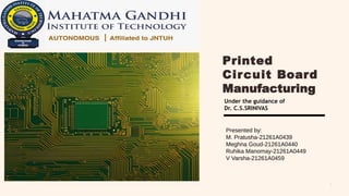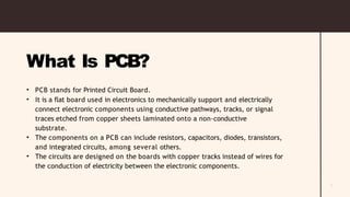 The document provides an overview of printed circuit boards (PCBs), detailing their definition, historical development, various types, and structural components. It outlines the PCB design and manufacturing process, including materials selection, drilling, etching, and testing methods. Additionally, it highlights the crucial applications of PCBs in industries such as automotive, medical, telecommunications, robotics, and industrial automation.