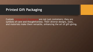 Printed gift packaging and custom gift boxes serve as symbols of care and thoughtfulness in gift-giving. Their diverse designs, sizes, and materials enhance the overall experience. They are available in wholesale options for greater accessibility.