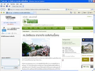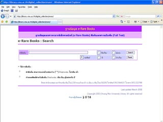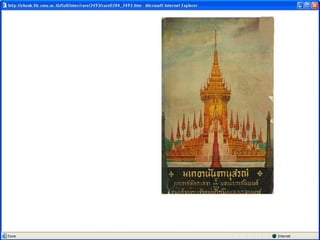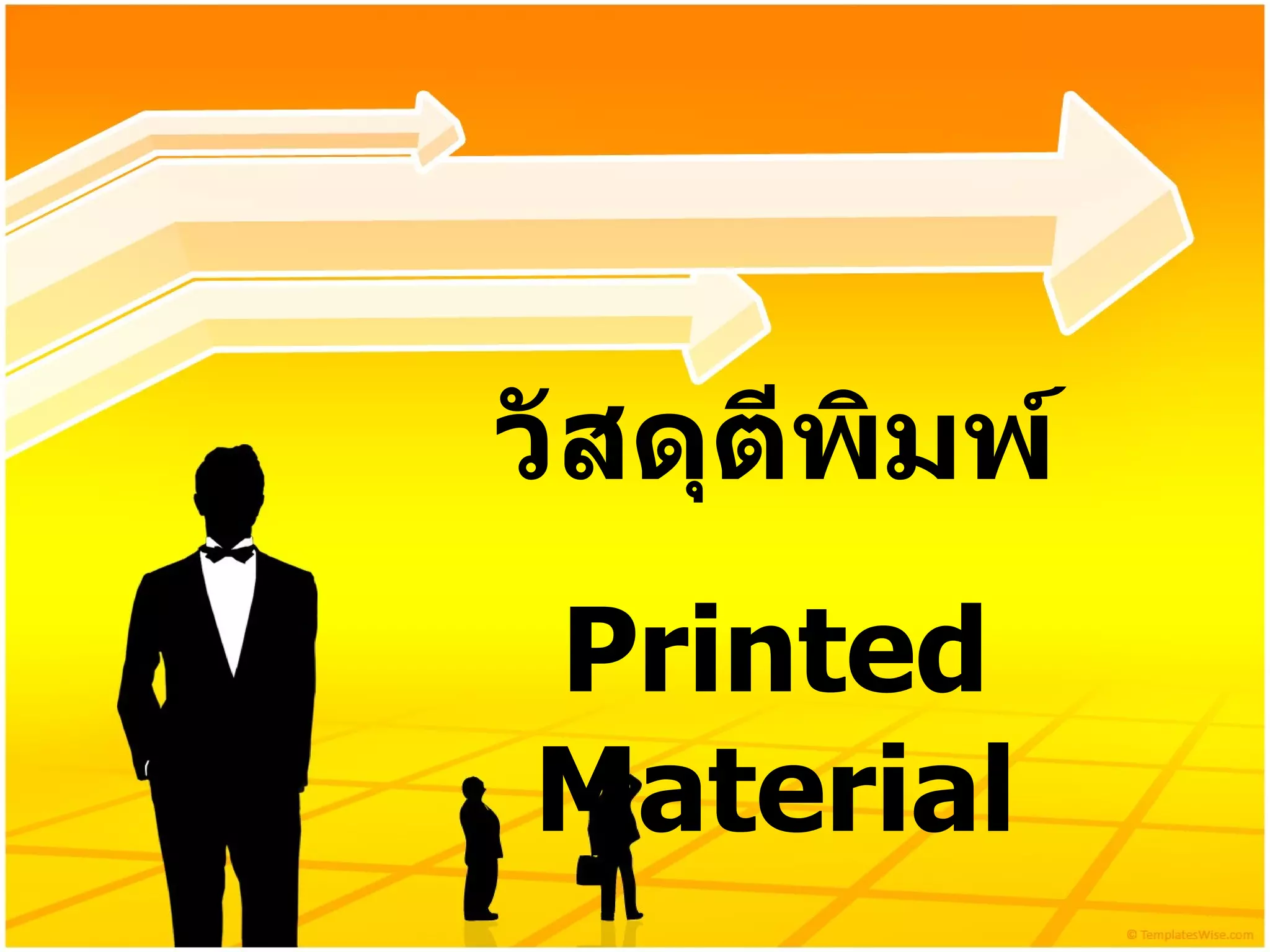 Printed Meterial 1. 2. 3. 4. หนังสือในห้องสมุดแบ่งเป็น 2 ประเภท หนังสือทั่วไป หนังสือวิชาการ หนังสือสารคดี หนังสือบันเทิงคดี หนังสืออ้างอิง แบ่งเป็น 9 ประเภท ** บทที่ 3 5. 6. 7. วารสาร ( Periodicals, Serial, Journal, Magazine ) มีรูปเล่มที่แน่นอน มีกำหนดออกเป็นระยะ ให้ข่าวสาร ความรู้ที่ทันสมัย ให้แนวคิดหลากหลายทัศนะโดย นำเสนอในรูปแบบบทความหลายบทความ และมีผู้แต่งหลายคน มีชื่อวารสาร ซึ่งการออกแบบต้องเหมือนกันทุกฉบับ ระบุปีที่ ฉบับที่ วันที่ เดือน ปี ที่ออกวารสาร มีเลขมาตรฐานสากลประจำสิ่งพิมพ์ต่อเนื่อง (ISSN) International Standard Serial Number 8. ชื่อวารสาร เลขปีที่ ฉบับที่ เดือน ปีพ . ศ . ที่ออก หมายเลข ISSN ชื่อบทความและ ชื่อผู้แต่งของแต่ละบทความ 9. ประเภทวารสาร 1. วารสารวิชาการ (Journal or Periodicals) 2. วารสารอาชีพ / การค้า ( Trade Magazine ) 3. วารสารทั่วไป หรือนิตยสาร ( magazine ) 10. วารสารวิชาการ ( Journal or Periodicals) ให้ความรู้ทั่วไป เรื่องเฉพาะด้าน เนื้อหาทันสมัย กลุ่มผู้อ่านคือนักวิจัย นักวิชาการ หรือบุคคลในสาขาวิชาชีพนั้นๆ ก่อนจัดพิมพ์มักมีการประเมินเนื้อหาโดยผู้เชี่ยวชาญก่อนเสมอ ( Peer Reviewed ) เป็นเอกสารปฐมภูมิที่มีความน่าเชื่อถือสูง 11. วารสารอาชีพ / เพื่อการค้า มีเนื้อหากึ่งวิชาการ ไม่มีการประเมินจากผู้เชี่ยวชาญ นำเสนอเนื้อหาเฉพาะเรื่อง อาจเป็นการวิเคราะห์เนื้อหาเฉพาะเรื่อง - สยามรัฐสัปดาห์วิจารณ์ - มติชนสุดสัปดาห์ - Newsweek - Far Eastern Economic Review 12. 13. 14. 15. 16. Book VS Journal ระยะเวลาการออกไม่สม่ำเสมอ เนื้อหานำเสนอเพียงเรื่องใดเรื่องหนึ่งตลอดทั้งเล่มถึงแม้ว่าจะมีการแบ่งเป็นบทหรือเป็นตอนก็ตาม หนังสือทั้งเล่มจะเขียนโดยผู้แต่ง คนเดียวหรือกลุ่มเดียว รูปแบบของขนาดและการใช้ตัวอักษรไม่เป็นมาตรฐานขึ้นอยู่กับการออกแบบตามโอกาส มีระยะเวลาการออกที่แน่นอนและสม่ำเสมอ วารสาร 1 ฉบับมีการนำเสนอเนื้อหาที่หลากหลาย ในรูปแบบของบทความ หรือคอลัมน์ โดยเนื้อหาในเล่มอาจเป็นเนื้อหาที่มีความสัมพันธ์กัน แต่ละบทความจะเป็นการเขียนของผู้แต่งที่ไม่ใช่คนเดียวกันทั้งเล่ม ( มีผู้แต่งหลายคน ) มีรูปแบบของขนาดตัวเล่ม ใช้ชื่อหรือแบบอักษรที่เป็นมาตรฐานเดียวกันทุกฉบับ 17. หนังสือพิมพ์ ( Newspaper) ให้ข่าวสาร เหตุการณ์ได้รวดเร็ว ทันกาล ให้ความรู้ในเรื่องต่างๆ ทั้งความรู้ทั่วไป ความคิดเห็นการวิเคราะห์ ความเป็นไปใน สังคมแต่ละสังคม ให้ความรู้เกี่ยวกับสภาพสังคม เพื่อพัฒนาชีวิตของคนในสังคม ไม่หลุดโลก 18. ส่วนประกอบของหนังสือพิมพ์ ข่าว ข่าวเบา ( หนังสือพิมพ์ประชานิยม ) ข่าวหนัก ( หนังสือพิมพ์คุณภาพ ) บทบรรณาธิการ ส่วนแสดงความคิดเห็น หรือวิเคราะห์ข่าว คอลัมน์ประจำ คอลัมน์ประจำของนักเขียน ภาพข่าว 