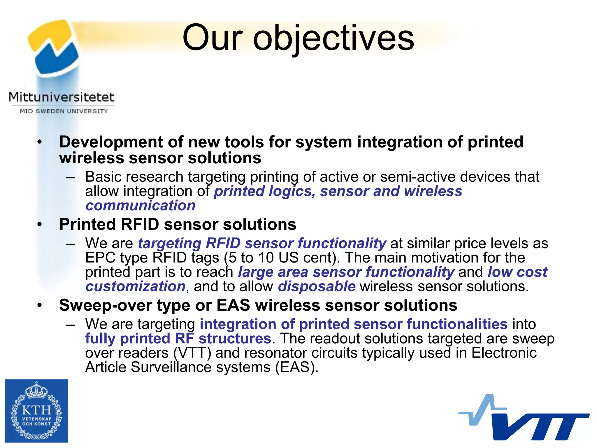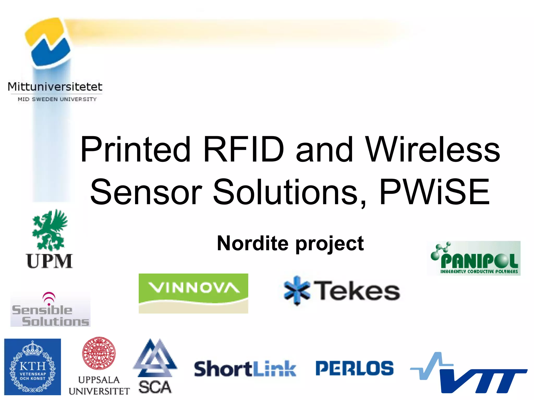 This document discusses the objectives and progress of the Nordite project, which aims to develop printed wireless sensor solutions and RFID tags. The goals are to 1) create tools for integrating printed sensors, logics and wireless communication, 2) develop printed RFID sensors cheaper than EPC tags, and 3) integrate printed sensors into sweep-over and EAS readers. Several demonstrations were created, including moisture and gas sensors integrated with RFID tags to monitor goods. The roadmap included both chipless and chip-assisted sensors. In conclusions, printed sensors and memories were successfully evaluated and integrated with RFID for applications like smart packaging.