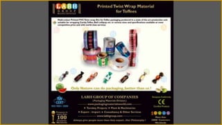 This document is about Labh Group of Companies' printed twist wrap material for toffees. It summarizes that Labh Group is a renowned manufacturer and exporter of high-quality packaging materials from India, with an advanced manufacturing facility, stringent quality control processes, and global presence serving over 100 countries. It highlights Labh Group's credentials, including ISO certification, awards received, and research and development efforts to supply innovative packaging products and develop long-term customer relationships.