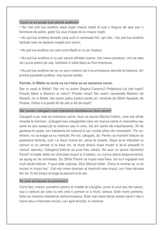 Părintele Cleopa oferă sfaturi despre mântuire, evidențiind cele trei condiții esențiale: credința în Hristos, faptele bune și smerenia, care sunt necesare indiferent de locul în care trăiește omul. În plus, el discută despre diverse reguli religioase, inclusiv despre împărtășanie, căsătorii mixte, și despre cum se pot oferi rugăciuni pentru cei decedați. De asemenea, subliniază importanța păstrării curățeniei spirituale și a împlinirii canoanelor bisericești în fața provocărilor vieții.