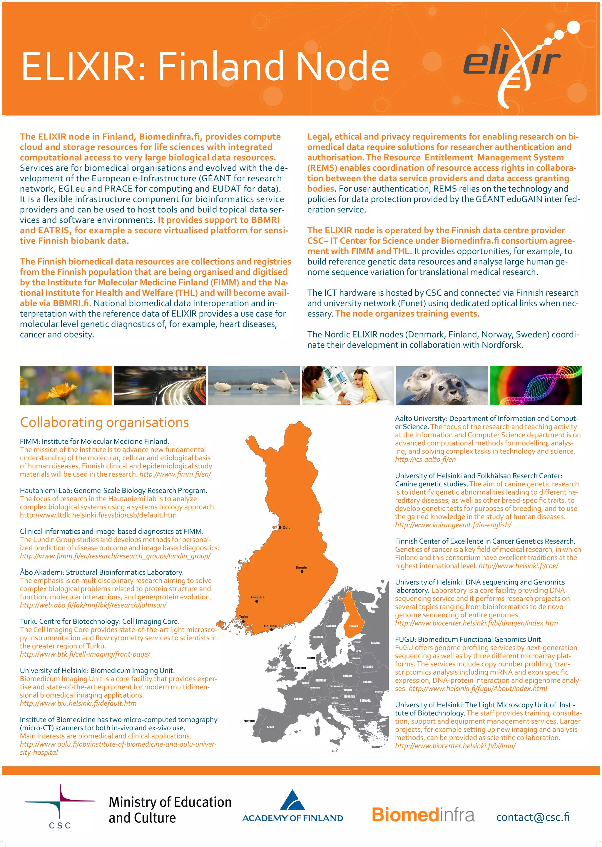 The ELIXIR node in Finland provides cloud computing and storage resources for life sciences research integrated with large biological data through its Biomedinfra.fi services. It supports authentication and authorisation for sensitive data access. As a flexible infrastructure, it hosts tools and builds data services for organizations like BBMRI and EATRIS. The node is operated through a consortium including universities and research institutes to enable collaborative research like analyzing human genome variations and building genetic reference resources.