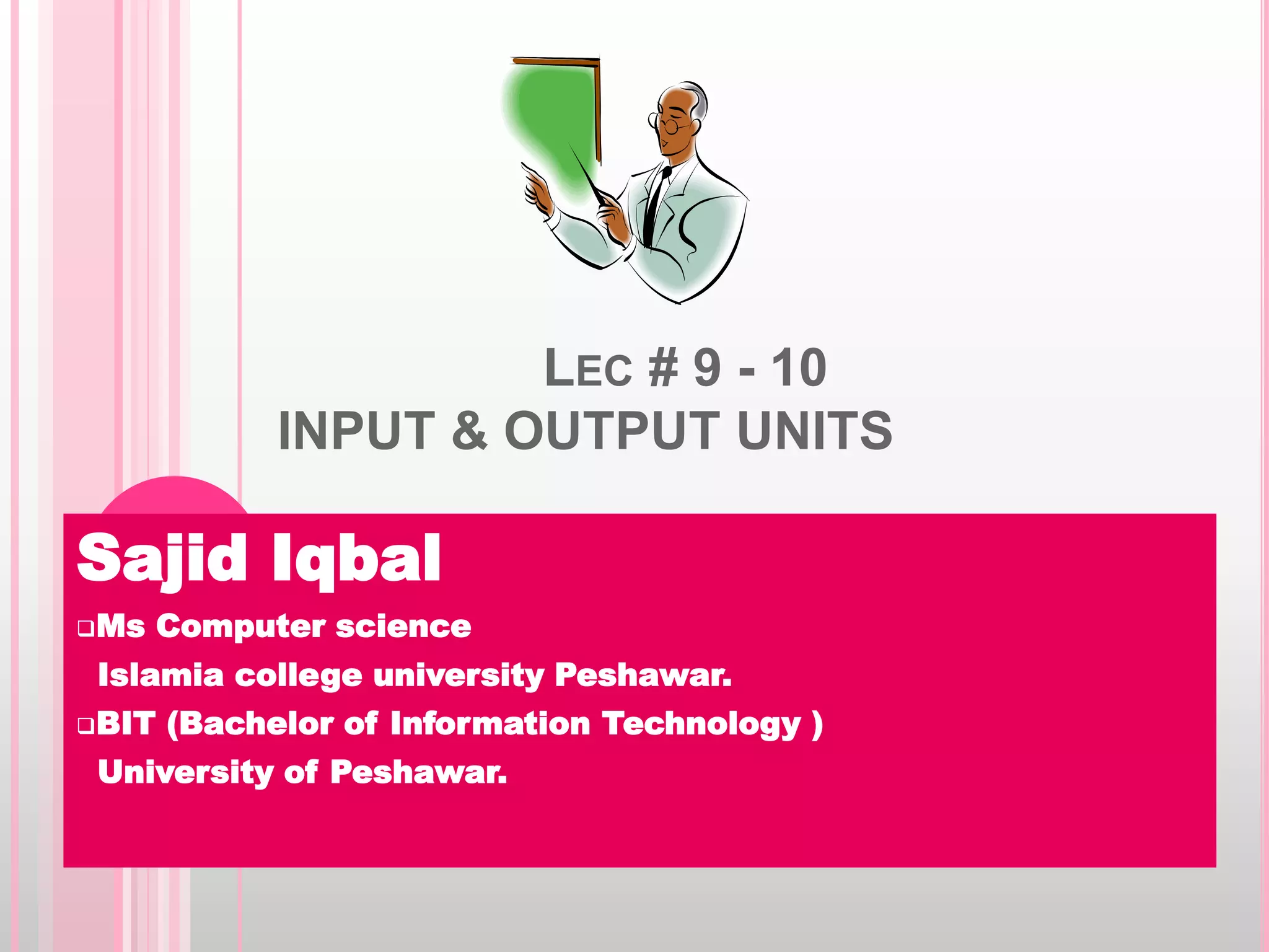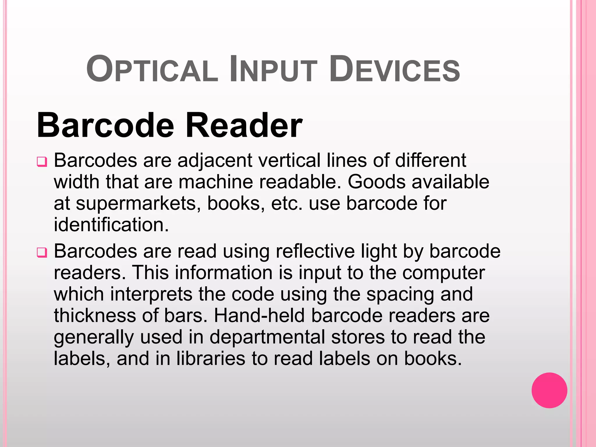 The document discusses various input and output devices used in computing. It describes barcode readers as optical input devices that read barcodes using light to input product identification information to computers. It then categorizes and explains different types of output devices, including hard copy devices like printers, plotters, and computer output microfilm as well as soft copy devices like monitors. It provides details on different printer technologies like impact printers (dot matrix, daisy wheel, drum) and non-impact printers (inkjet, laser printers) and describes their key features and uses.