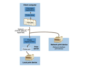 This document discusses different types of printers and printer access. It describes local printers that are directly attached to a system and network printers that are located elsewhere on a network. It also mentions that Active Directory services allow for remote printing administration and monitoring of print queues over the internet. The document provides information on printer pools and examples of user and group permissions assigned to printers.