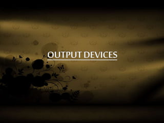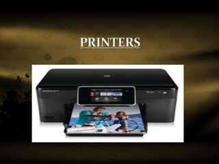 Printers and plotters are output devices that communicate computer-generated information to users. Printers produce representations of electronic documents on paper or film using various technologies like inkjet, laser, or solid ink. Plotters are used to print large vector graphics and maps and work by moving a pen or other drawing instrument across paper. Common types of plotters include drum, flatbed, pen, electrostatic, and inkjet plotters. The document discusses the characteristics and technologies of various printers and plotters.