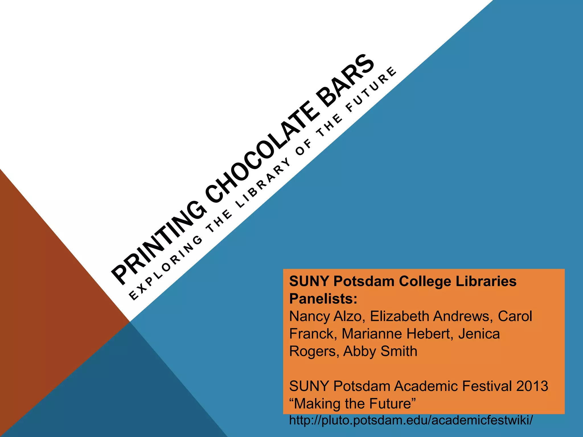 The document summarizes a panel discussion on the future of libraries held at SUNY Potsdam College. The 6 panelists discussed how user behaviors and technologies are changing libraries. Users now expect instant access to information anywhere through mobile devices. Libraries are providing more digital resources and collaborative spaces while print collections decline. New models like purchase-on-demand and e-books are shaping library collections. Discovery tools aim to improve search across resources but challenges remain regarding evaluation, serendipity and supporting different user levels.