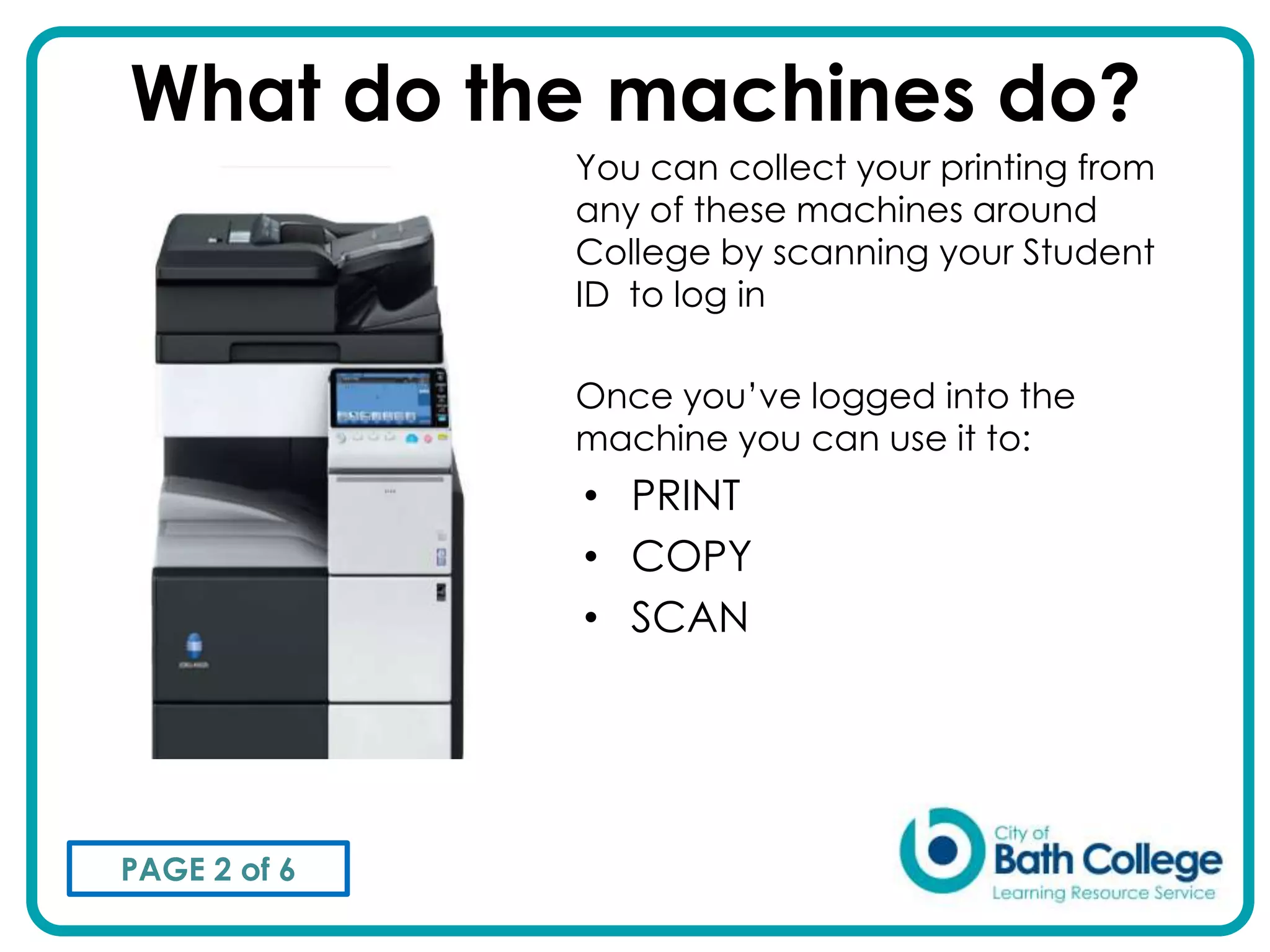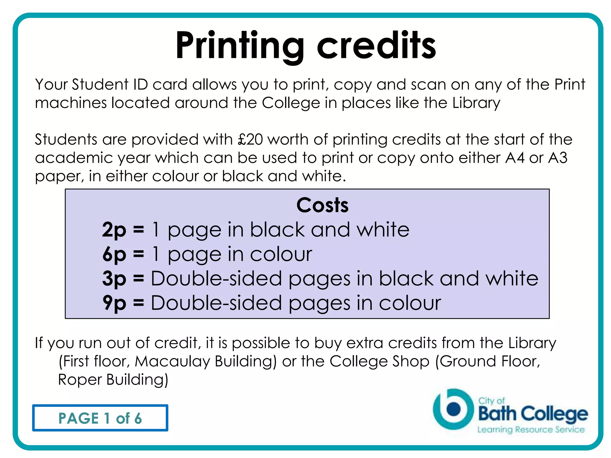 Students are provided £20 of printing credits per academic year which can be used to print or copy single or double-sided pages in black and white or color. Printing costs 2p for a black and white page, 6p for a color page, with double-sided pages costing 3p or 9p respectively. If credits run out, more can be purchased from the Library or College Shop.