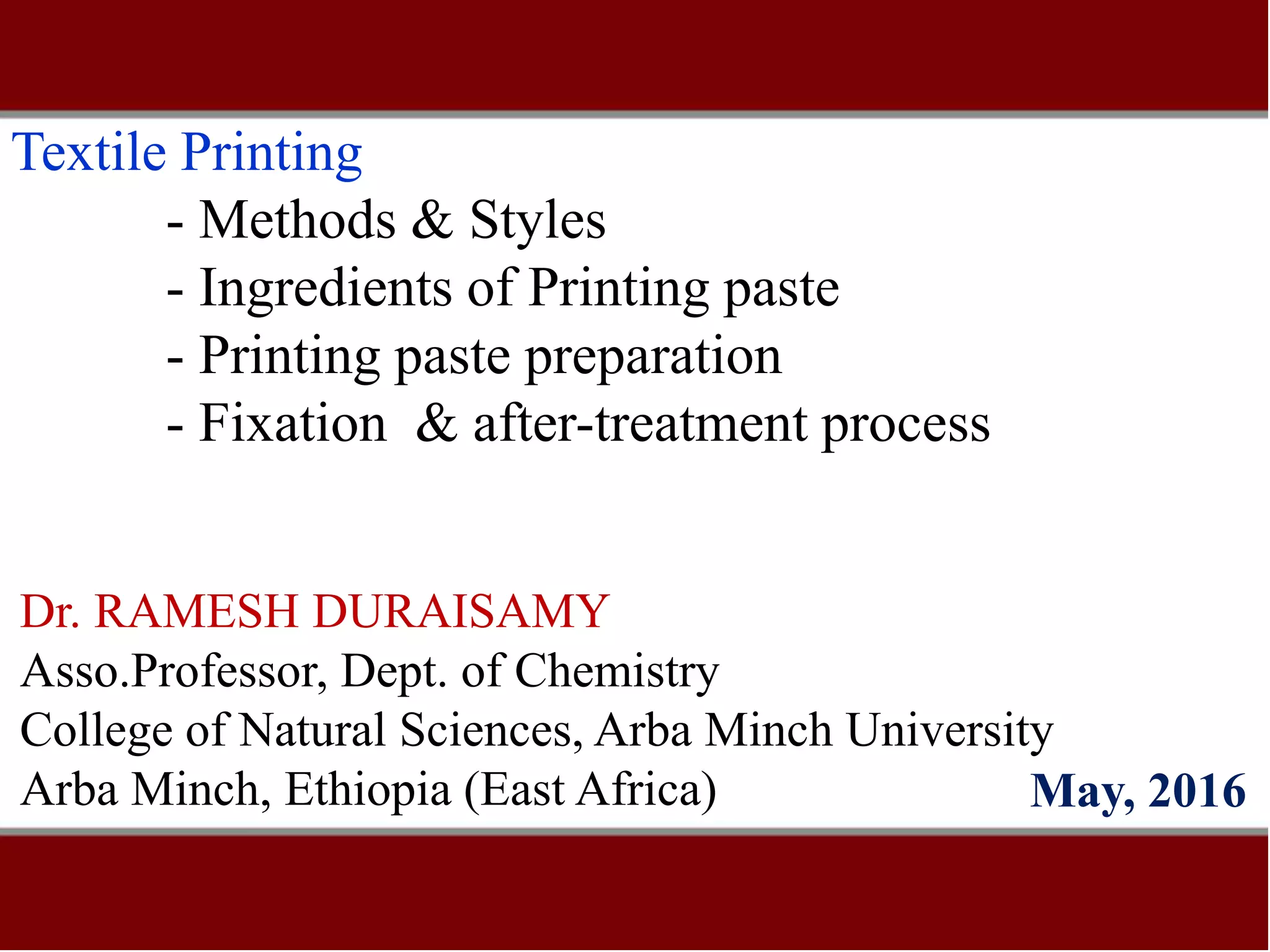 The document discusses textile printing, detailing various methods, styles, and the ingredients of printing paste, including preparation and fixation processes. It outlines four main types of printing: direct, mordant, resist, and discharge, and emphasizes the importance of machinery and human skills in achieving quality prints. Additionally, it covers the components of printing paste, the steps involved in the printing process, fixation methods, and potential printing defects.
