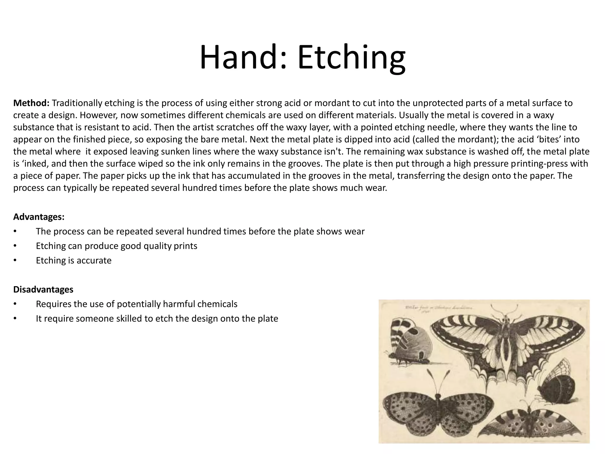 The document discusses various printing techniques including etching, linocut, screen-print, woodcut, lithography, letterpress, gravure, screen process, photocopying, laser printing, inkjet printing, and desktop publishing. It provides details on the method, advantages, and disadvantages of each technique.