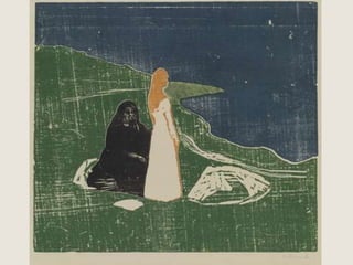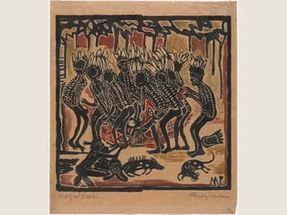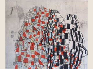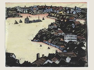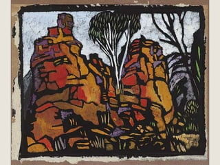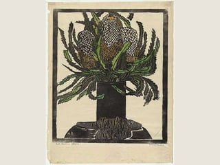 The document provides a detailed history of printmaking, highlighting the invention of the movable type printing press in China and its subsequent development in Europe, particularly by Johann Gutenberg. It reviews influential artists in printmaking, including Edvard Munch, Albrecht Durer, Margaret Preston, Sarah Amos, and Shepard Fairey, showcasing their unique styles and contributions. Additionally, the document includes definitions and explanations of various printmaking techniques and terminology.
