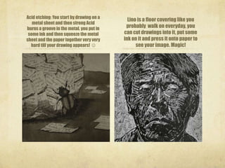 This document discusses various printmaking techniques including acid etching, lino printing, collographs, direct offset monoprinting, additive and reductive monoprinting, monotypes, gyotaku fish printmaking, and gelatin monoprinting. The techniques involve drawing or collaging onto plates or surfaces, applying ink, and pressing onto paper to transfer the image. Some techniques like acid etching involve etching into metal plates while others like collographs build textures through collage that are then printed.