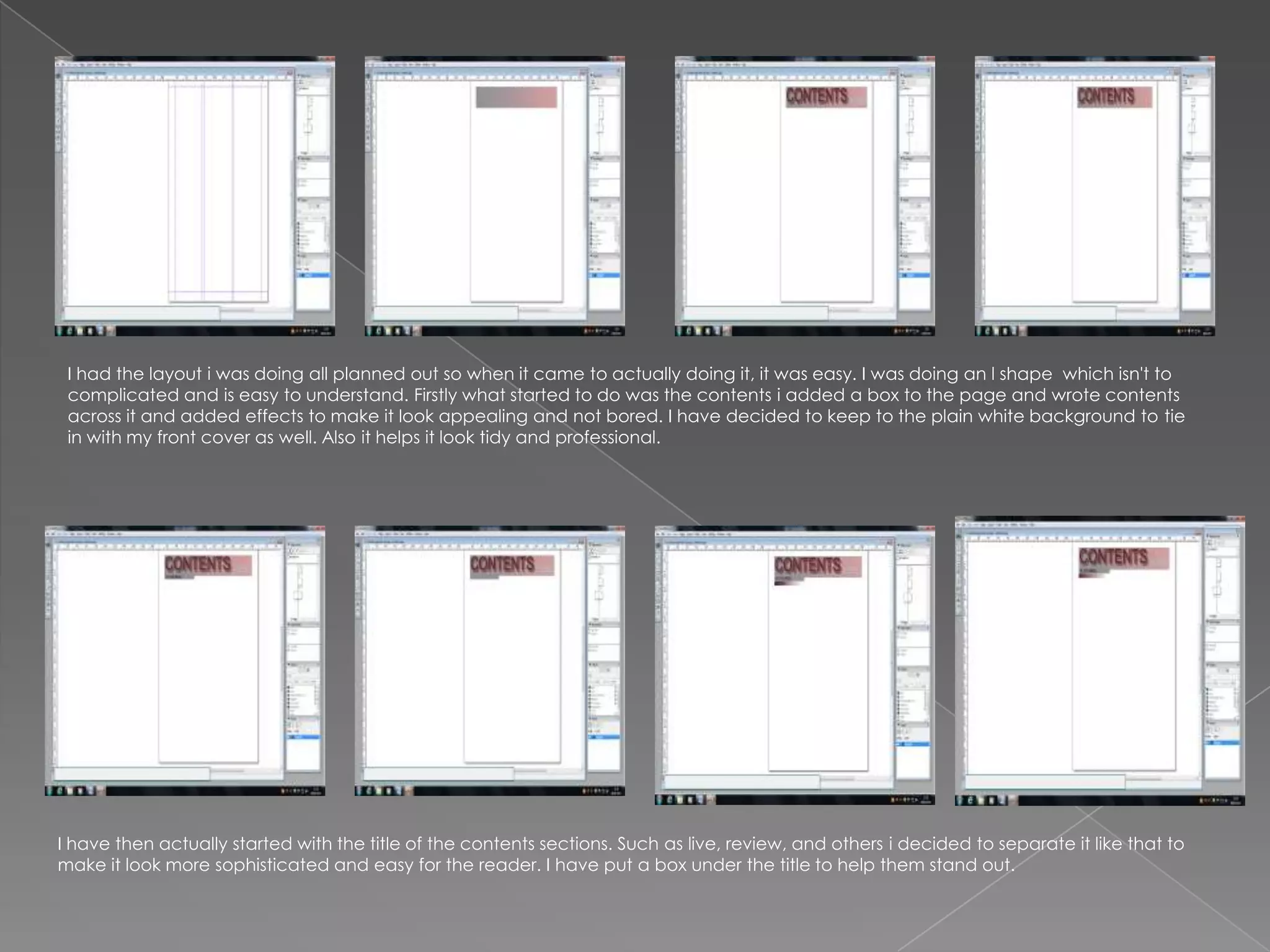 The document summarizes the steps taken to layout the contents page of a magazine. It describes adding section titles and boxes, formatting the text and numbers in different colors, including a subscription section and cover picture, and strategically placing relevant photos to complement the contents list. The key challenge was selecting and arranging photos to create a cohesive design with a clear focal point around the band interview photo.