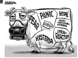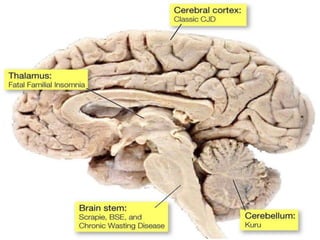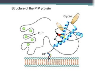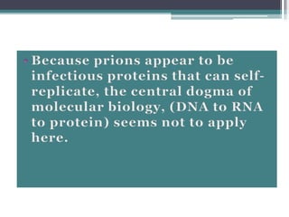 Prions are abnormal infectious protein particles that cause neurodegenerative diseases. They can occur through infection, genetic mutation, or spontaneously. Prions are unique in that they can replicate without nucleic acids by converting normal prion proteins (PrP-sen) into an abnormal form (PrP-res). Accumulation of PrP-res causes neuronal death and symptoms like dementia. Common prion diseases include Creutzfeldt-Jakob disease in humans and mad cow/scrapie in animals. There is no cure for prion diseases and most result in death within a year of symptoms appearing.
