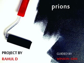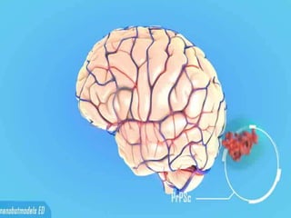 Prions are abnormal protein particles that can cause neurodegenerative diseases. They have a normal function in the body but can transform into an infectious form. When this happens, they induce other normal prion proteins to adopt the abnormal shape. Common prion diseases include scrapie in sheep, mad cow disease, and Creutzfeldt-Jakob disease in humans. There are currently no effective treatments for prion diseases, so prevention and diagnosis are important.