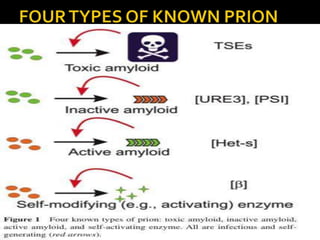 Prions are infectious proteins that can cause neurodegenerative diseases such as mad cow disease and CJD in humans. Prions lack nucleic acids and are composed solely of abnormal versions of host-encoded proteins. They propagate by converting normal protein molecules into the abnormal prion form. This causes disease by disrupting normal protein folding in the brain. While prion diseases are generally untreatable and fatal, research on yeast prions has provided insights into prion transmission and conversion mechanisms at the molecular level.