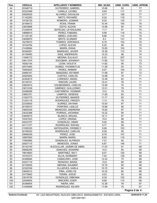 Y NOMBRES IND. ACAD. UNID. CURS. UNID. APROB. 10.6620348719 GUTIERREZ, GABRIEL 92 7744 9.8320323499 CANELA, LEONEL 117 7745 9.7720929529 ALVAREZ, DOUGLAS 106 7746 9.2421142293 NIETO, RICHARD 118 7747 8.2519726730 ROMERO, JOSMAR 133 7748 10.4420188472 ROAS, FRANK 100 7649 13.0623833868 GOYO, ALEXIS 83 7550 11.721244816 SOTELDO, LEYDILAURA 91 7551 9.9919686910 PEREZ, FABIANA 118 7552 8.8621125130 ABREU, AVELINO 114 7553 8.323836870 BRITO, ELISMAR 131 7554 8.1616278573 TORRES, VERONICA 153 7555 6.2518104794 LOPEZ, ALEXIS 89 7556 10.6521428964 MARIN, DIANA 103 7457 10.3820348281 MARQUEZ, JAVIER 112 7458 10.3324159485 DIAZ, ANDERSON 96 7459 6.2511848172 MEDINA, EULALIO 207 7460 11.8523811574 ESCOBAR, JOHANGY 101 7361 11.8218262154 LEON, VIOLETA 95 7362 11.2820075465 GOMEZ, YHONNEYLIS 93 7363 8.4719483933 PEREZ, AIRMAR 144 7364 11.9824680161 MANZANO, KEYMAR 87 7265 12.8824925942 CORTEZ, CARLOS 79 7166 12.4824393615 LORENZO, ANGEL 83 7167 12.4125140751 RINCON, LAURA 78 7168 12.0823903914 COLMENÁREZ, CARLOS 75 7169 12.0123815339 GIMÉNEZ, GUILLERMO 79 7170 12.022268556 CASTAÑEDA, YESIMAR 79 7171 11.8523852701 CAMPOS, GENESIS 83 7172 11.7121503775 GUTIERREZ, MAIKER 83 7173 11.021243118 RODRIGUEZ, FREDDY 79 7174 10.9322330830 SUÁREZ, DAYANA 87 7175 10.8624160072 PORFIRIO, LIDILUZ 90 7176 10.8223845249 MENDOZA, ANDREINA 87 7177 10.2223032388 PORRAS, JHOANNA 95 7178 10.1123845015 BLANCO, MIGUEL 87 7179 10.019347523 LOPEZ, ORIANA 98 7180 9.9224022757 GONZÁLEZ, OMAR 99 7181 9.7724711377 RODRÍGUEZ, RAFAEL 95 7182 9.6821055335 ANTEQUERA, CRISBELY 103 7183 9.5820189352 RODRIGUEZ, CARLOS 95 7184 8.7820666029 PEREZ, JOSE 107 7185 8.6518997800 MARÍN, MARÍA 116 7186 7.2117993694 GONZALEZ, ALFREDO 92 7187 6.8720927115 MENDOZA, JONAS 146 7188 11.0325142740 ALEGULLAR, JAZMIN DE ABRIL 81 6989 10.425856209 SANCHEZ, EDWARD 85 6990 8.0119818943 MARTINEZ, WILY 120 6991 7.9319745373 SILVA, NORMARY 129 6992 12.4324386994 CAMACARO, JOSE 75 6893 10.924537119 REINOSO, MARIA 80 6894 10.7922105830 MEDINA, DAUMER 95 6895 10.7522322536 OLLARVES, KARLA 84 6896 10.3223845012 PIÑA, JOSELYN 80 6897 9.5323779462 TERÁN, JOSUÉ 93 6898 9.3923918726 GONZALEZ, DIBEANA 103 6899 8.6622095604 BRICEÑO, EDER 115 68100 12.3824399004 RIERA, ANA 79 67101 11.4921459568 RODRIGUEZ, KILVER 75 67102 25/04/2016 11.30 Pagina 2 de 4 Sistema Cumlaude AV. LAS INDUSTRIAS. NUCLEO OBELISCO. BARQUISIMETO - ESTADO LARA. 02512591581
