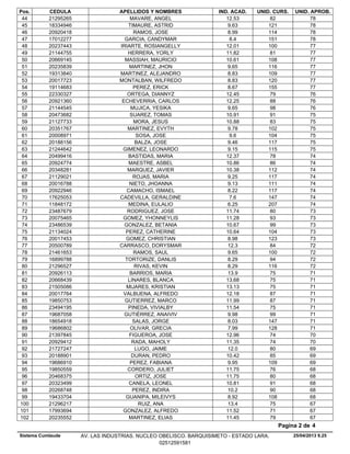 Y NOMBRES IND. ACAD. UNID. CURS. UNID. APROB. 13.0322190668 CONTRERAS, ANDREINA 60 56162 12.3223849081 VALERA, MOISES 60 56163 12.1521140295 MAMBELL, OSLEYNIN 60 56164 11.420923830 FREITEZ, PATRICIA 63 56165 10.7220922025 DIAZ, RICARDO 76 56166 10.1320250268 BARRIOS, JESUS 83 56167 10.0120923849 SANCHEZ, ARIANNYS 86 56168 9.9121297909 BRACAMONTE, PAOLA 72 56169 9.6220766230 BARAZARTE, JOSE 76 56170 9.5321302860 PEREZ, GABRIELA 78 56171 8.8820499032 HERRERA, LAZARO 84 56172 8.8219114972 ORTUÑO, ANGELICA 84 56173 8.7120250537 MAJANO, DANIELA 95 56174 10.7820866843 COLMENARES, ELY 71 55175 10.7421142109 SÁNCHEZ, ARGENIS 84 55176 10.0922333494 MENDEZ, MARIANNY 71 55177 7.5816898234 MENDOZA, ENMANUEL 137 55178 6.3417229010 PALACIOS, OSCAR 118 55179 25/04/2013 9.25 Pagina 4 de 4 Sistema Cumlaude AV. LAS INDUSTRIAS. NUCLEO OBELISCO. BARQUISIMETO - ESTADO LARA. 02512591581