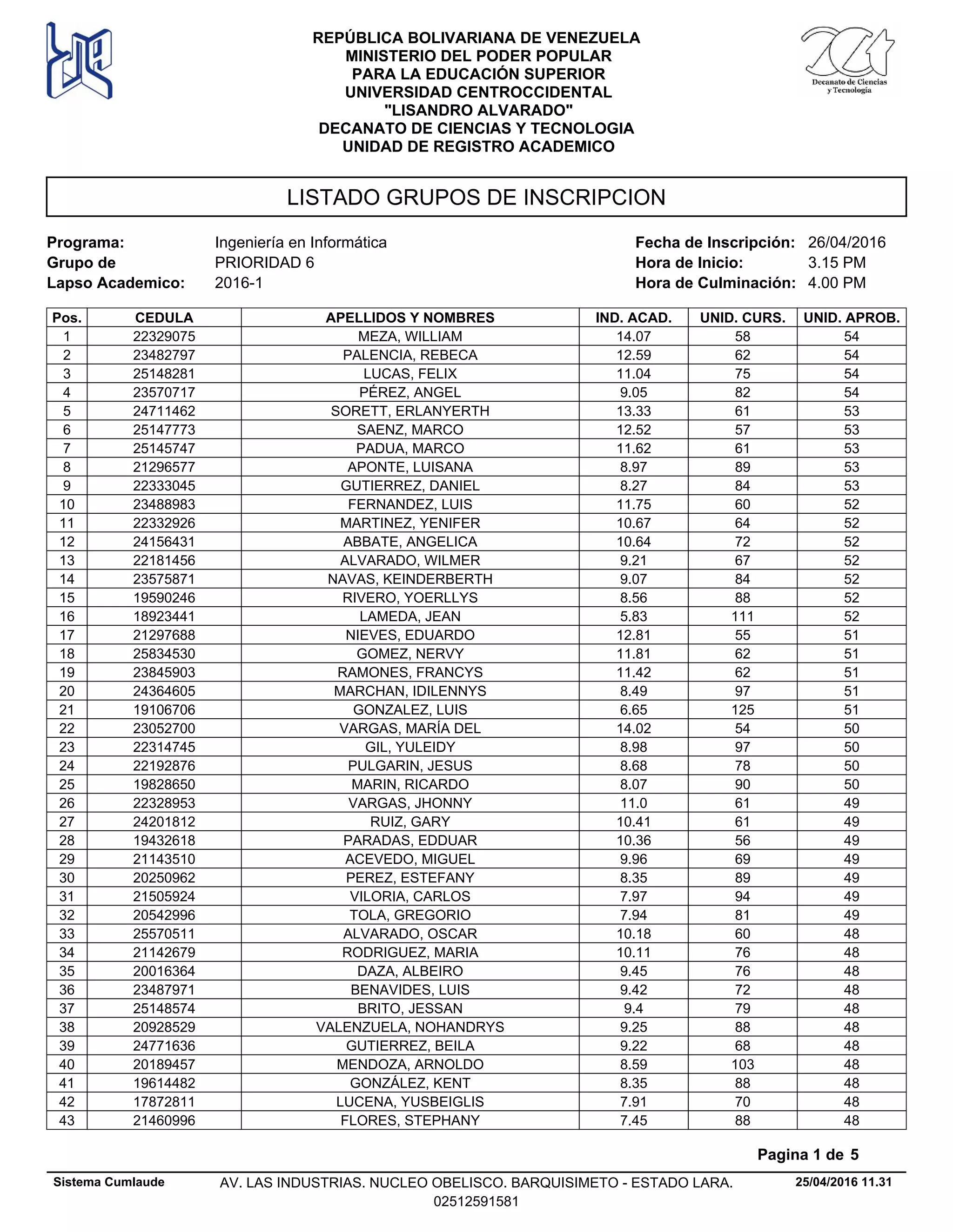 INSCRIPCION Programa: Ingeniería en Informática Lapso Academico: 2016-1 Grupo de PRIORIDAD 6 Fecha de Inscripción: 26/04/2016 Hora de Inicio: 3.15 PM Hora de Culminación: 4.00 PM REPÚBLICA BOLIVARIANA DE VENEZUELA MINISTERIO DEL PODER POPULAR PARA LA EDUCACIÓN SUPERIOR UNIVERSIDAD CENTROCCIDENTAL "LISANDRO ALVARADO" DECANATO DE CIENCIAS Y TECNOLOGIA UNIDAD DE REGISTRO ACADEMICO Pos. CEDULA APELLIDOS Y NOMBRES IND. ACAD. UNID. CURS. UNID. APROB. 14.0722329075 MEZA, WILLIAM 58 541 12.5923482797 PALENCIA, REBECA 62 542 11.0425148281 LUCAS, FELIX 75 543 9.0523570717 PÉREZ, ANGEL 82 544 13.3324711462 SORETT, ERLANYERTH 61 535 12.5225147773 SAENZ, MARCO 57 536 11.6225145747 PADUA, MARCO 61 537 8.9721296577 APONTE, LUISANA 89 538 8.2722333045 GUTIERREZ, DANIEL 84 539 11.7523488983 FERNANDEZ, LUIS 60 5210 10.6722332926 MARTINEZ, YENIFER 64 5211 10.6424156431 ABBATE, ANGELICA 72 5212 9.2122181456 ALVARADO, WILMER 67 5213 9.0723575871 NAVAS, KEINDERBERTH 84 5214 8.5619590246 RIVERO, YOERLLYS 88 5215 5.8318923441 LAMEDA, JEAN 111 5216 12.8121297688 NIEVES, EDUARDO 55 5117 11.8125834530 GOMEZ, NERVY 62 5118 11.4223845903 RAMONES, FRANCYS 62 5119 8.4924364605 MARCHAN, IDILENNYS 97 5120 6.6519106706 GONZALEZ, LUIS 125 5121 14.0223052700 VARGAS, MARÍA DEL 54 5022 8.9822314745 GIL, YULEIDY 97 5023 8.6822192876 PULGARIN, JESUS 78 5024 8.0719828650 MARIN, RICARDO 90 5025 11.022328953 VARGAS, JHONNY 61 4926 10.4124201812 RUIZ, GARY 61 4927 10.3619432618 PARADAS, EDDUAR 56 4928 9.9621143510 ACEVEDO, MIGUEL 69 4929 8.3520250962 PEREZ, ESTEFANY 89 4930 7.9721505924 VILORIA, CARLOS 94 4931 7.9420542996 TOLA, GREGORIO 81 4932 10.1825570511 ALVARADO, OSCAR 60 4833 10.1121142679 RODRIGUEZ, MARIA 76 4834 9.4520016364 DAZA, ALBEIRO 76 4835 9.4223487971 BENAVIDES, LUIS 72 4836 9.425148574 BRITO, JESSAN 79 4837 9.2520928529 VALENZUELA, NOHANDRYS 88 4838 9.2224771636 GUTIERREZ, BEILA 68 4839 8.5920189457 MENDOZA, ARNOLDO 103 4840 8.3519614482 GONZÁLEZ, KENT 88 4841 7.9117872811 LUCENA, YUSBEIGLIS 70 4842 7.4521460996 FLORES, STEPHANY 88 4843 25/04/2016 11.31 Pagina 1 de 5 Sistema Cumlaude AV. LAS INDUSTRIAS. NUCLEO OBELISCO. BARQUISIMETO - ESTADO LARA. 02512591581