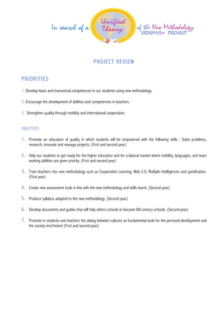 1. The document outlines priorities and objectives for a project review. The top priorities are developing student competencies using new methodologies, encouraging teacher development, and strengthening quality through mobility and international cooperation. 2. The objectives are to empower students with skills like problem-solving, research, innovation and project management in the first two years. Teachers will be trained in new methodologies in the first year. New assessment tools and adapted syllabi will be created in the second year.