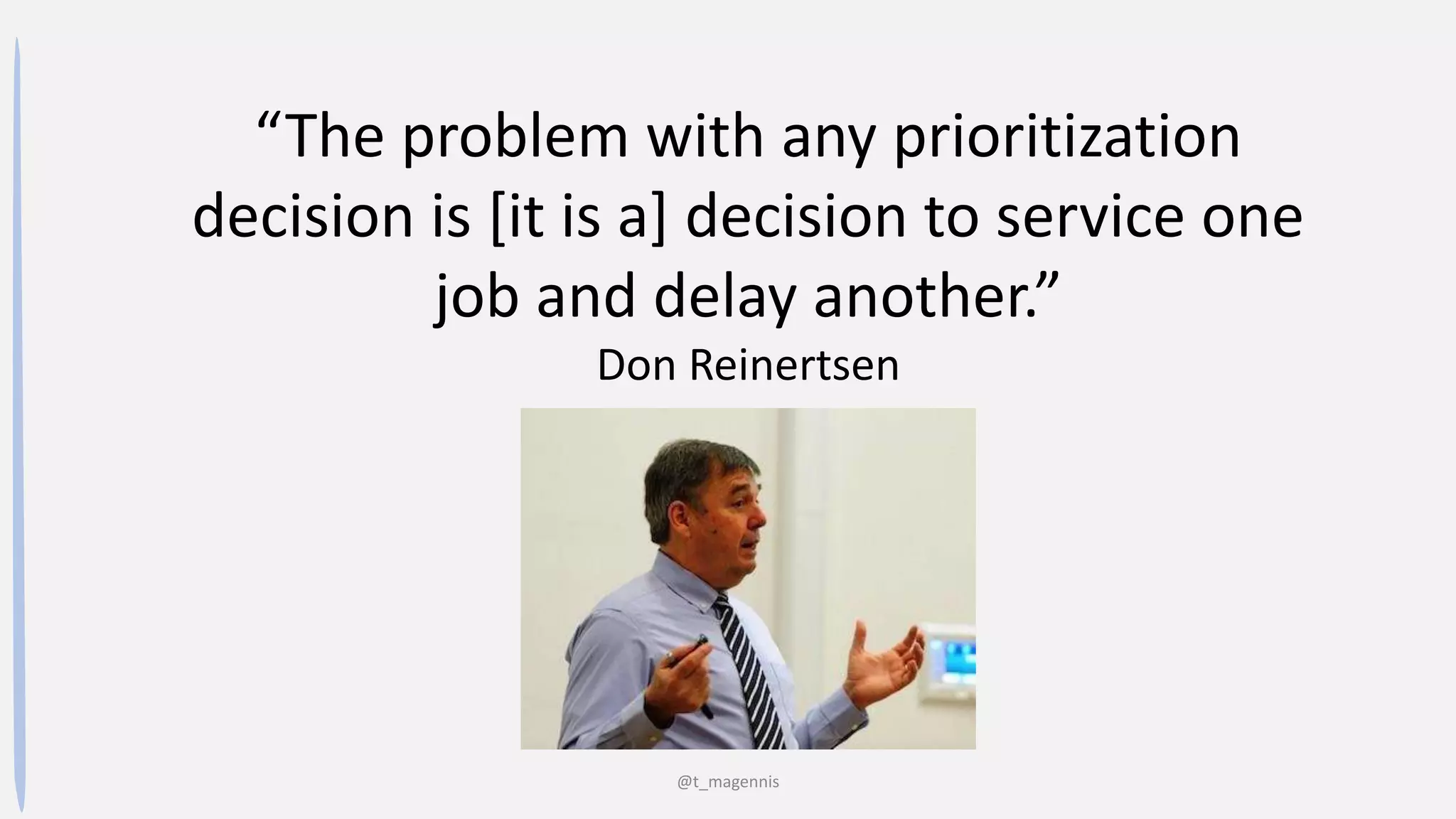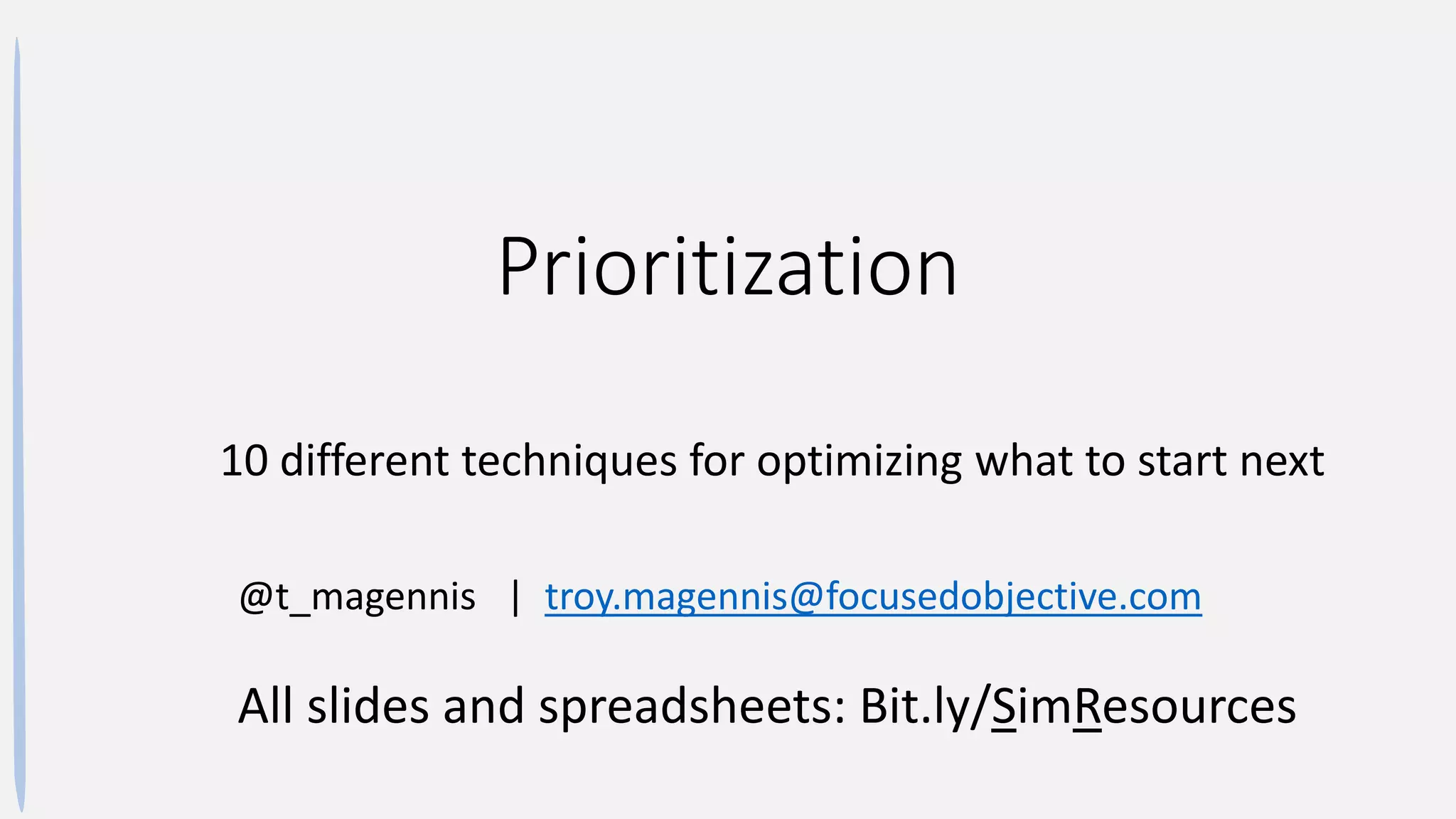 The document discusses various techniques for prioritizing tasks and projects, emphasizing the economic implications of delays and the importance of choosing methods based on investment flexibility and market maturity. It highlights common challenges such as value uncertainty, dependencies, and the need for clear value definitions. The author aims to provide a cheat-sheet for clients to aid in prioritization decisions while addressing the context in which different methods may be more or less effective.