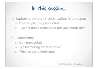 The document discusses various prioritization techniques for agile teams, ranging from simple to sophisticated methods, and includes practical exercises and simulations. It highlights common pitfalls in prioritization, offers tips for effective use, and presents value-mapping techniques to classify features based on impact and effort. The content emphasizes collaboration and clarity in setting priorities while managing stakeholder expectations.