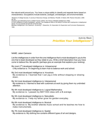 The document summarizes Howard Gardner's theory of multiple intelligences, which posits that there are eight distinct types of intelligence rather than a single general intelligence. It lists the eight intelligences as linguistic, logical-mathematical, spatial, bodily-kinesthetic, musical, interpersonal, intrapersonal, and naturalistic intelligences. For each intelligence, it provides a brief description and examples of related occupations. It then has a student prioritize and provide evidence for their most to least developed of the eight intelligences.