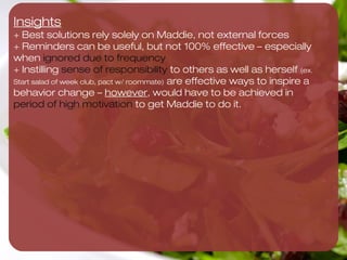 This document discusses ways to encourage Stanford student Maddie to pack a homemade salad for lunch at least 3 times per week. The most effective solutions identified are for Maddie to join a fitness challenge to eat 3 salads per week, make salads as soon as grocery shopping on Sundays, and refrigerate prepared salads. Reminders and one-time actions are deemed less effective for creating sustainable behavior change. Next steps proposed include further research, gauging interest, iterating on easy solutions, and using reminders to spark motivation.