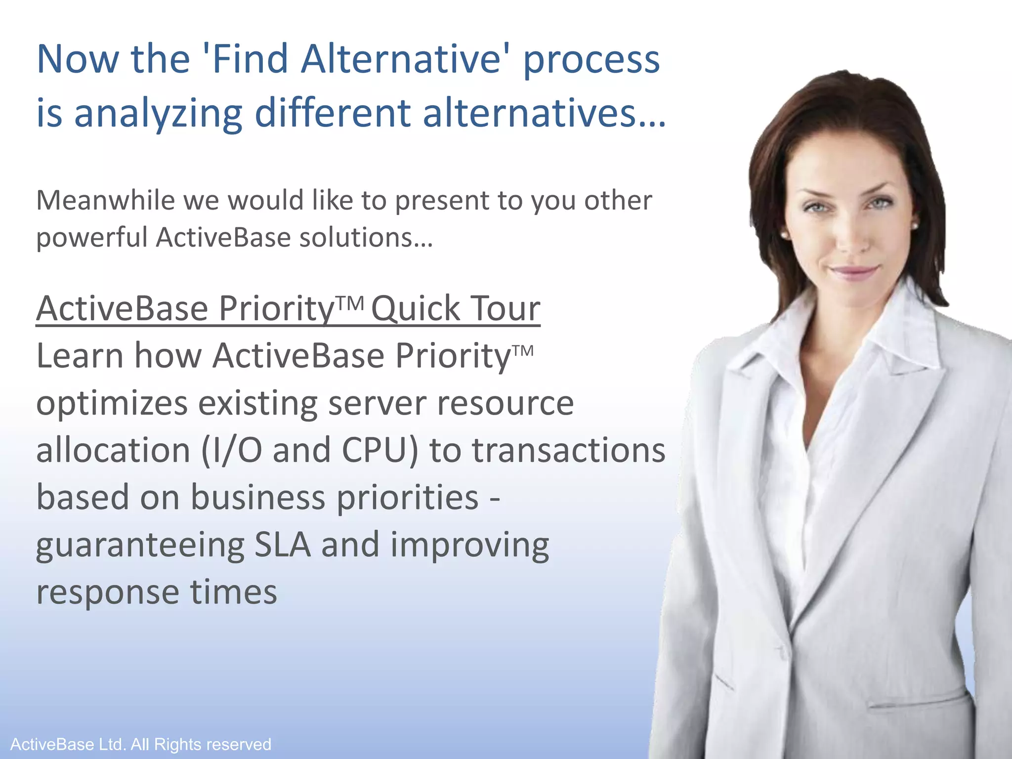 ActiveBase Priority allows administrators to optimize server resource allocation to transactions based on business priorities. This ensures service level agreements are met and response times are improved. The solution monitors CPU and I/O usage and uses a rule engine to prioritize activities, reducing one transaction's consumption from 95% to acceptable levels. Rules can be created to manage resource allocation based on request, session, and operating system process groupings.