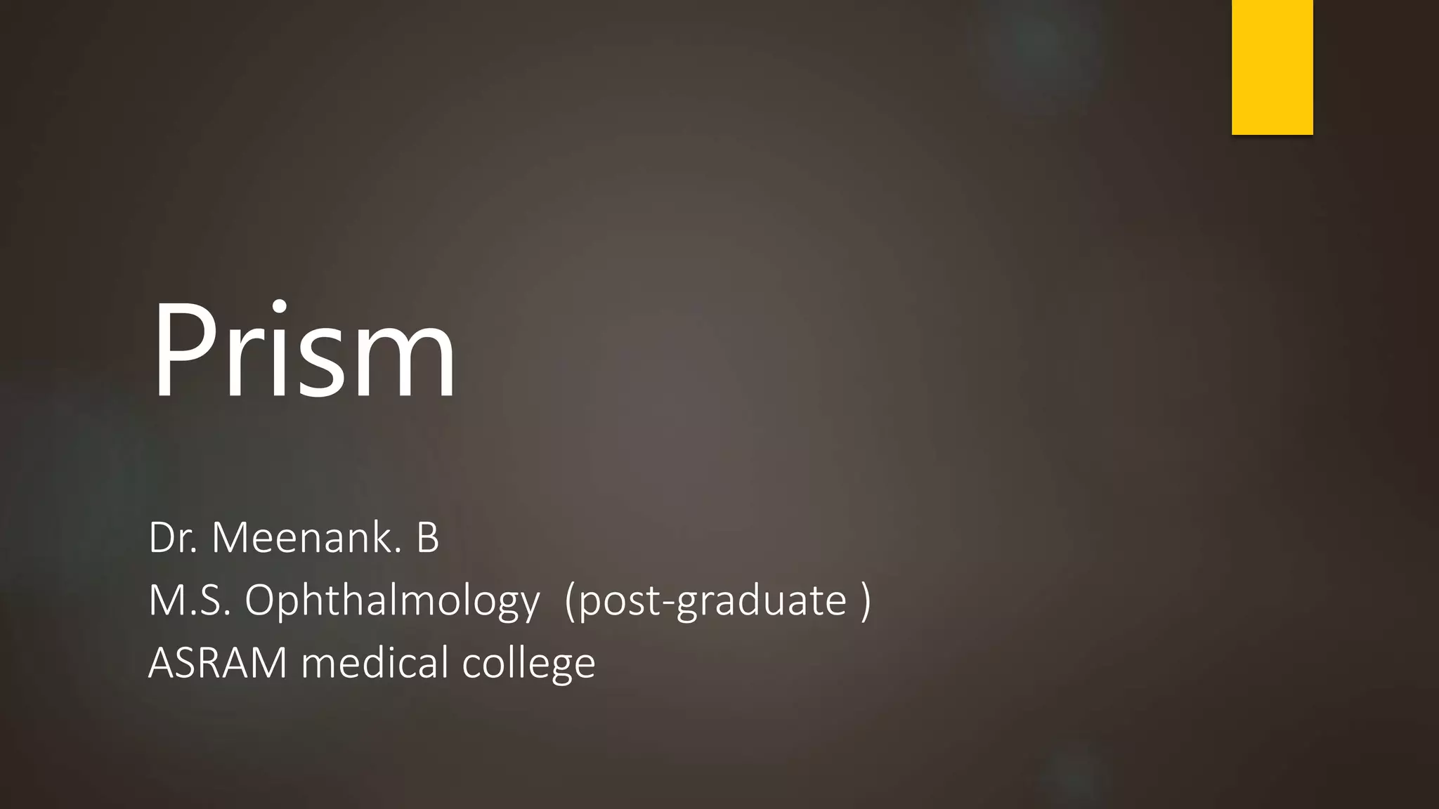 1. Prism is a portion of a refractive medium bounded by two plane surfaces inclined at an angle. It deviates light passing through it towards its base due to refraction.