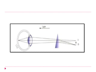 Ophthalmic prisms are used to correct vision issues. A prism is defined by two plane surfaces that meet at an angle called the refracting or apical angle. Light passing through a prism is deviated towards the base, causing objects to appear displaced towards the apex. The power of a prism can be measured in prism diopters, with 1 prism diopter producing 1cm of apparent displacement of an object 1m away. Prisms form an erect, virtual image that is displaced towards the apex. They are oriented based on the position of the base as in, base up, down, in or out.