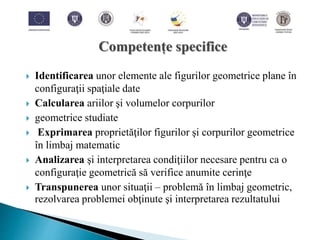 Documentul detaliază proiectul „evaluarea națională: inovație pentru formarea competențelor-cheie”, finanțat prin fondul social european, având ca scop îmbunătățirea educației și formării profesionale în România. Acesta include o varietate de activități pentru învățarea formelor geometrice, calcularea ariilor și volumelor, precum și aplicarea teoriei geometrice în probleme practice. Se prezintă exemple și indicații de rezolvare pentru diverse tipuri de prisme și aplicații geometrice, împreună cu sugestii pentru evaluarea finală.