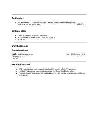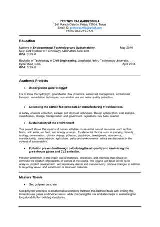 This document is a resume for Prithvi Raj Karreddula that summarizes his education and experience. He has a Master's degree in Environmental Technology and Sustainability from New York Institute of Technology and a Bachelor's degree in Civil Engineering from Jawaharlal Nehru Technology University. His academic projects focused on topics like underground water in Egypt, the carbon footprint of vehicle tire manufacturing, environmental sustainability, and pollution prevention. His master's thesis addressed geo polymer concrete as an alternative method to limit greenhouse gas emissions. He has certifications in OSHA health and safety and skills in GIS, AutoCAD, and Microsoft Office. His work experience includes working as a graduate assistant at NYIT facilities department.