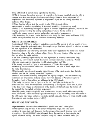 1. The document discusses the use of differential scanning calorimetry (DSC) to determine purity levels through analysis of melting peaks. It describes how new DSC instrumentation incorporates thermal lag corrections directly into heat flow signals for more accurate purity analysis.