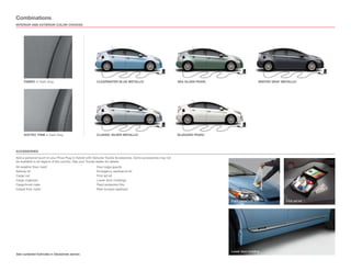 The document provides information on the 2012 Prius Plug-in Hybrid. It highlights that the vehicle can drive up to 11 miles on electric power alone, has a quick 3 hour charge time from a standard 120V outlet, and has an EPA rating of 95 mpge in electric mode and 50 mpg in hybrid mode. It also lists standard and available features such as navigation, remote climate control, and dynamic radar cruise control. The document provides photos of the exterior and interior, color options, and specifications.