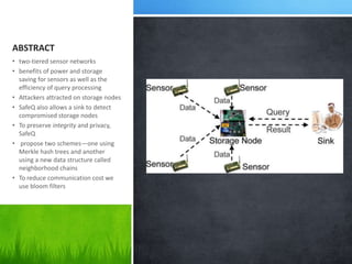 The document discusses a protocol called SafeQ for preserving privacy and integrity of range queries in two-tiered sensor networks, highlighting its benefits in power, storage efficiency, and query processing. It proposes two schemes using Merkle hash trees and neighborhood chains to ensure that storage nodes cannot obtain or manipulate sensitive data. Furthermore, SafeQ enables the sink to detect compromised storage nodes, thus enhancing overall security in hostile environments.