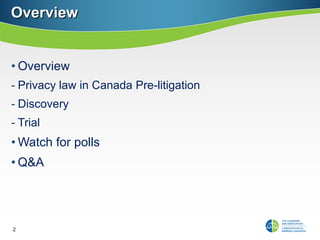 The document covers privacy issues related to civil litigation in Canada, including pre-litigation access to employee communications, the application of privacy laws, and implications in the discovery and trial stages. It discusses the evolving landscape of privacy law, particularly concerning personal information and evidence, and highlights the need for balancing privacy rights with legal obligations. Various case studies and legal principles are referenced to guide legal professionals in navigating privacy challenges in litigation.